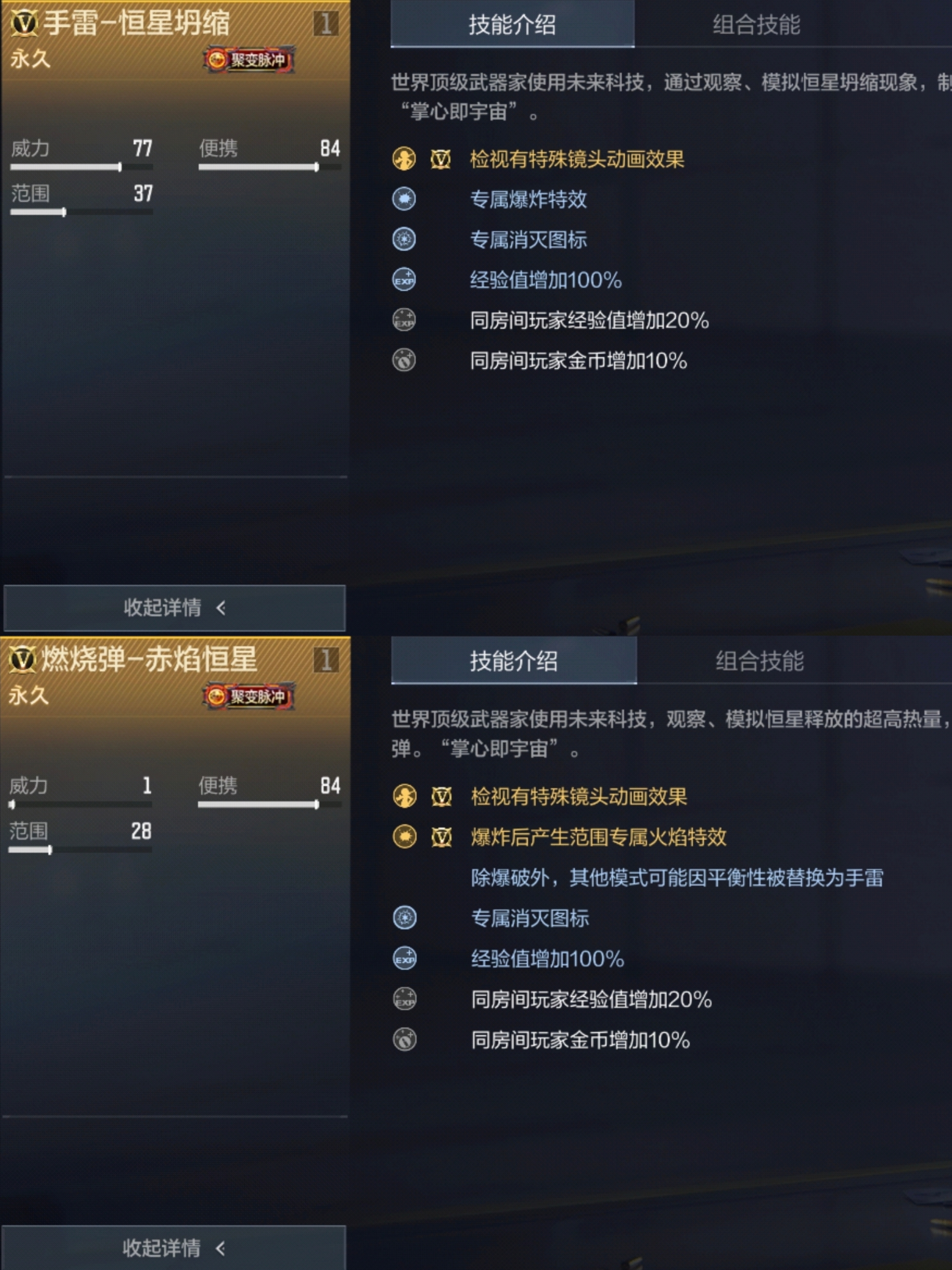 两者的组合技能也略有不同,同时装备手雷-恒星坍缩、闪光弹-星核耀光、烟雾弹-星核迷云可激技能:爆炸范围扩大;在此基础上再装备燃烧弹-赤焰恒星可激活技能:燃烧弹持续时间+1秒。