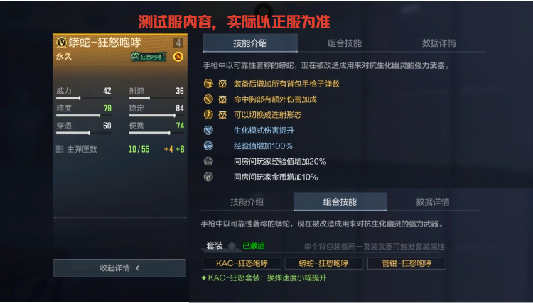 蟒蛇-狂怒咆哮的技能在命中胸部时会造成额外伤害;该武器可切换为连射状态。其组合技能是换弹速度小幅度提升,在近距离作战时切换为连射状态具有一定优势。
