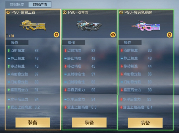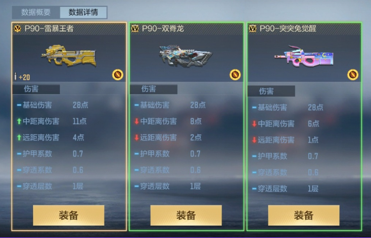 这里对比了同系列的两把武器,我们可以看到P90-雷暴王者在中远距离的伤害上,都要高于其他两款武器,其余的伤害数据三款武器一致。