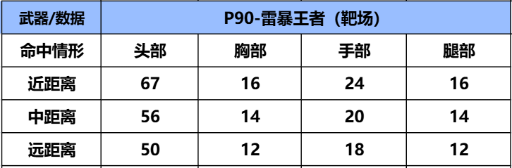 这里在靶场对P90-雷暴王者进行了伤害测试。结果显示:近距离射击时,头部伤害为67,胸部和腿部伤害为16,手部伤害为24;中远距离的伤害均有一定距离衰减。这一特性符合冲锋枪的武器定位,其优势在于高射速,因此通过射速弥补了单发伤害较低的劣势。