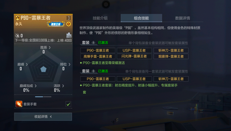 P90-雷暴王者拥有以下专属技能:生化模式下可使用应急闪光弹、生化模式伤害提升,以及生化模式载弹量提升。这些技能使其在生化模式中能充分发挥优势。