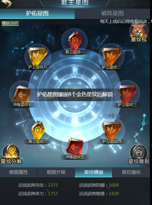 护佑星图的8个部位主要是增加的近战武将的四维属性。