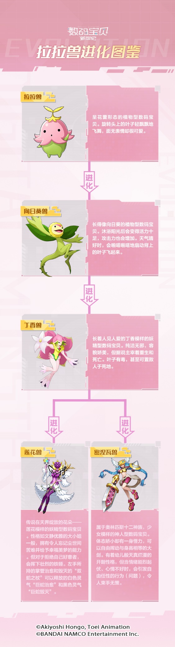 本期将介绍游戏内拉拉兽其中两条进化路线,进化路线1:拉拉兽→向日葵兽→丁香兽→莲花兽,进化路线2:拉拉兽→向日葵兽→丁香兽→密涅瓦兽,随着冒险进程不断向前推进,更多进化路线还待队长在游戏内体验哦~向日葵兽