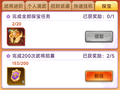 探宝任务分为武将招募、阵营招募、普通探宝、高级探宝。其中高级探宝和普通探宝要通关【战役】5-15才能解锁。武将招募任务可以在--中完成即可完成任务。阵营招募任务可以在--中完成即可完成任务。