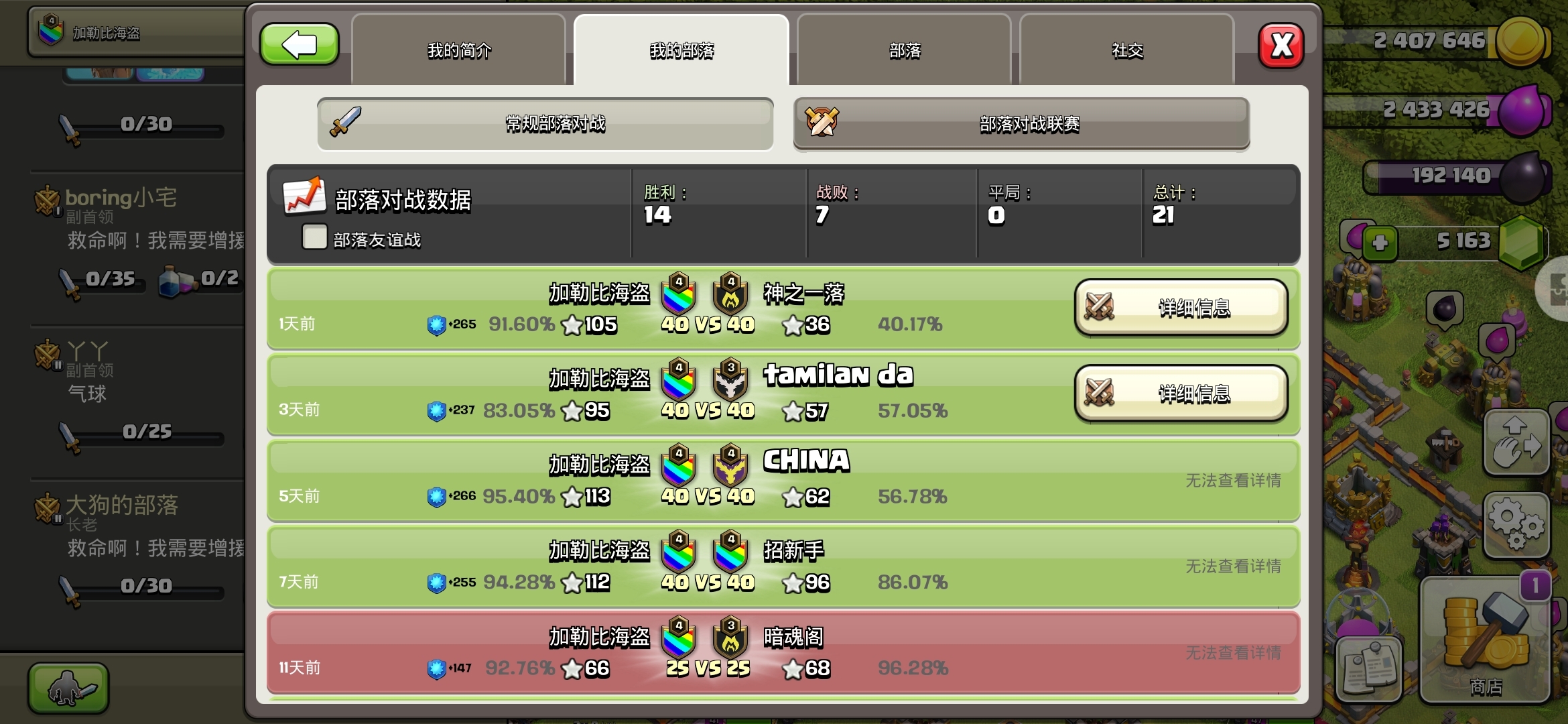 部落赛是一直开,有时会停两天,太累了,7个号全带,开40人的。捐兵。打架,部落战。基本很少有时间打资源。连输的时候心情就不好,停两天调整一下。还好,目前这几天遇到的都是菜鸡互啄 m,勉强能赢。