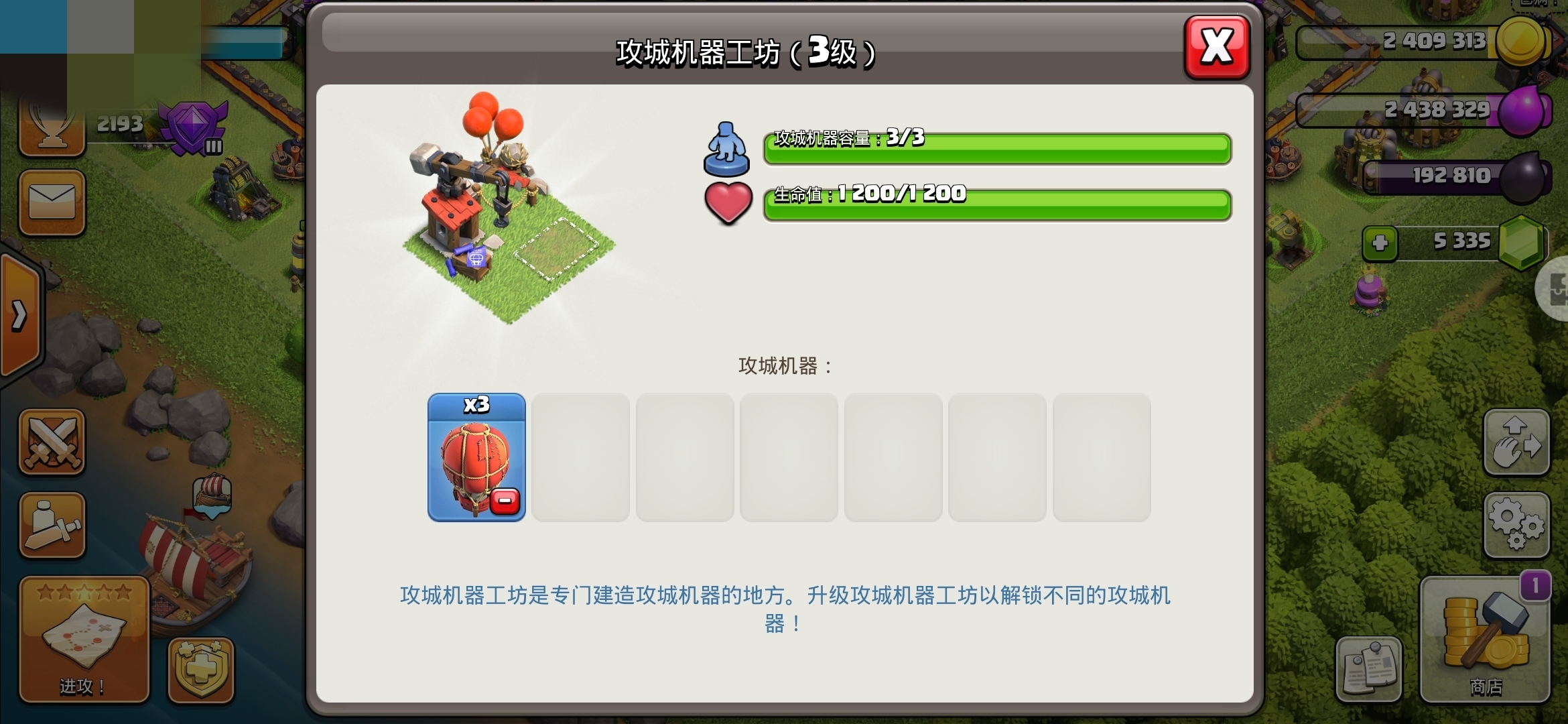 部落高手不多。低本很多,基本就只有我一个人一个12本的号捐兵。为了捐工程车。速到12了,直接两个锤子干到工程机械坊3级,可以捐了。