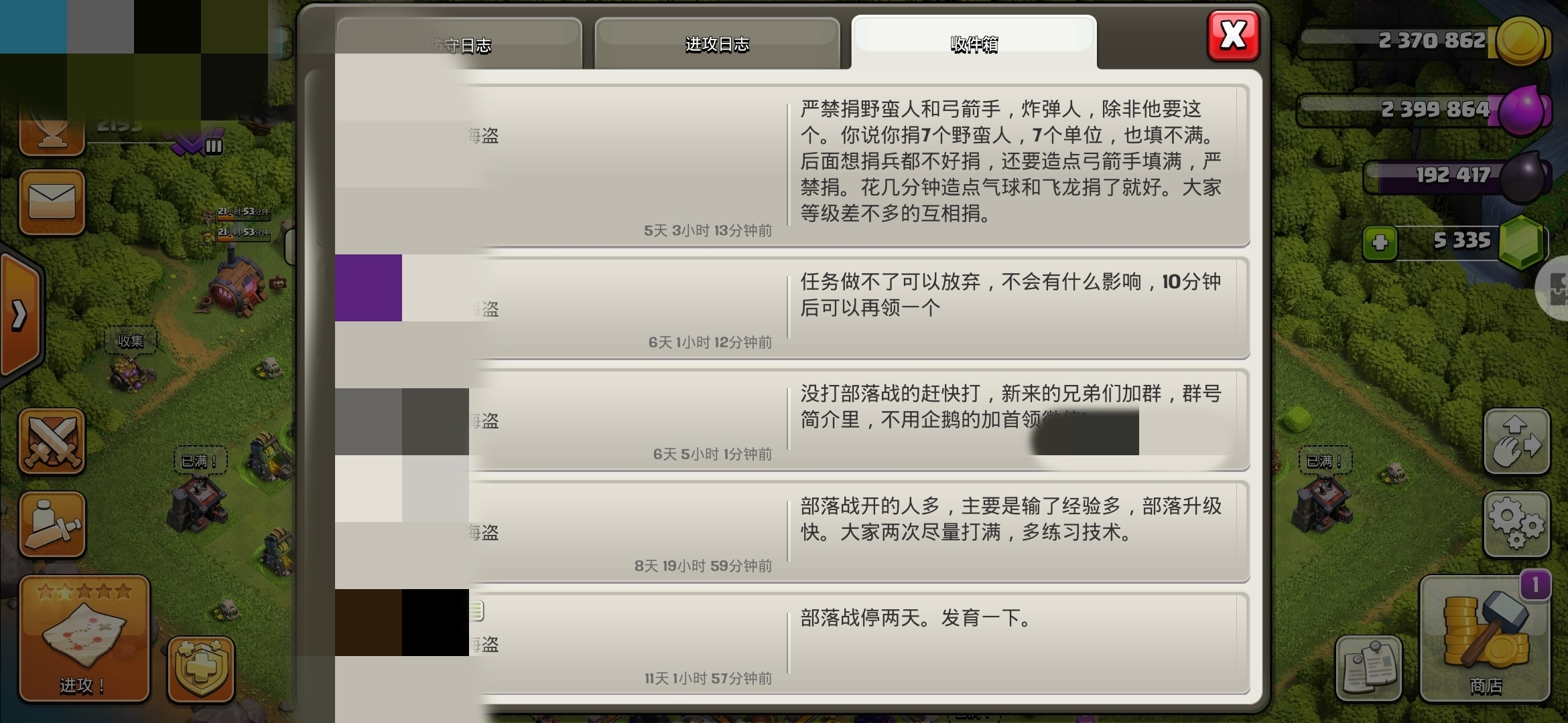 部落没有设置什么规矩,没什么捐兵要求,刚好放假时间多就上线捐兵。也会很努力的交一些新手如何做竞赛,打联赛,打部落战,创立部落才发现萌新还是挺多的。