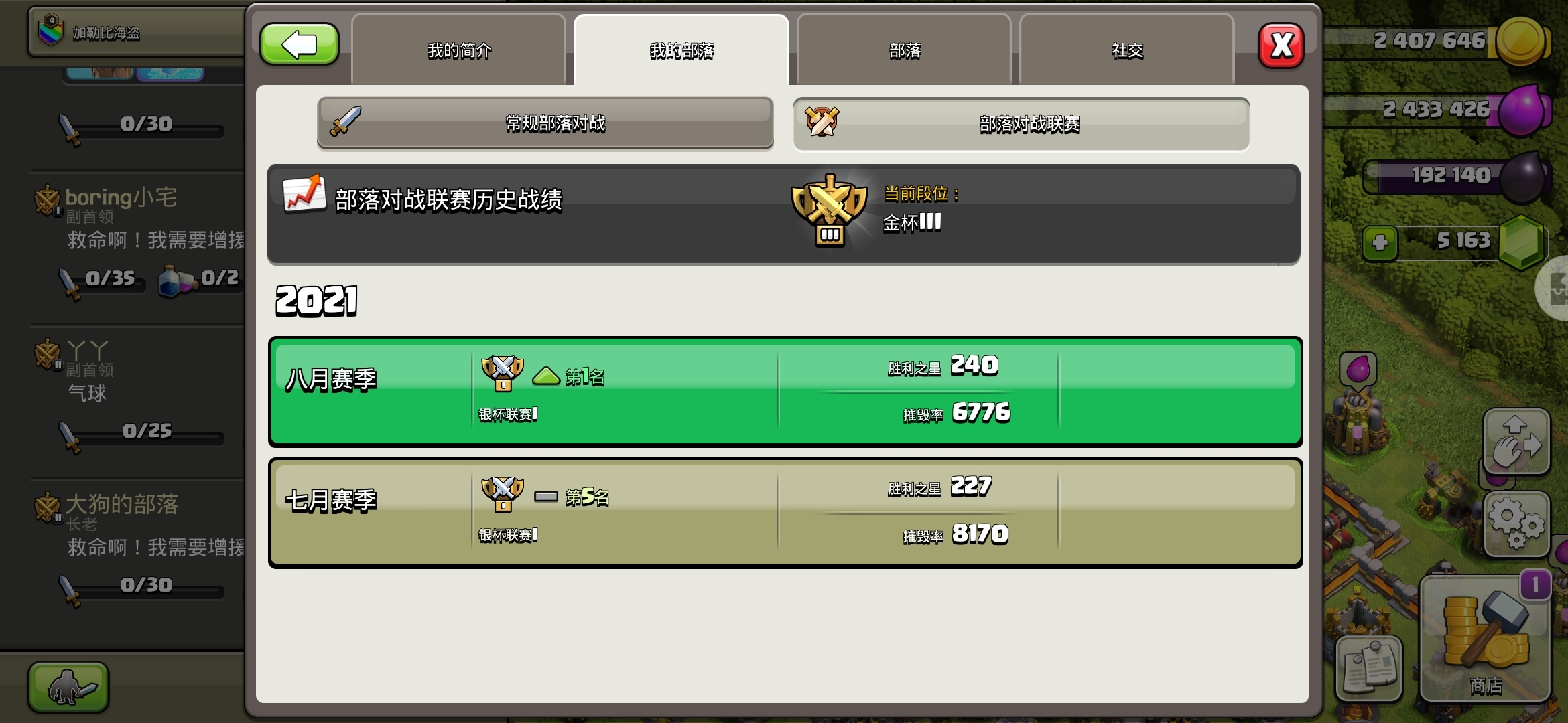 部落联赛呢,这第三次还没开始。第一次定级白银一,第二次晋级黄金三。慢慢发展吧。