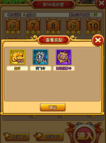 普通关卡中每一城关卡都会有星数达成宝箱获取,宝箱内有高级招募令、金币以及突飞令等道具获取。