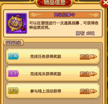 高级招募令虽然比较普通,但是并没有一次性大量获取的办法,所以玩家短时间想靠高级招募令获得大量将魂是比较难的。但是也不可以忽视这一点点招募令所带来的收益,毕竟长远来看其能带来的收益也是十分可观的。