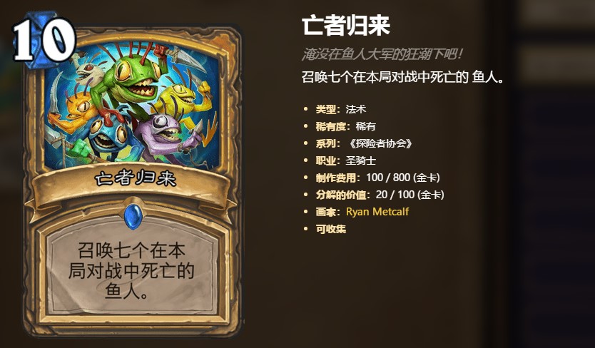 最后要聊的就是亡者归来了。相较于上面两张卡牌,亡者归来本身的强度看似不高,需要一段时间的准备。但是有什么说什么,如果说一个鱼人骑可以稳定拍出两波王者归来的话,那基本上就代表对面已经走远了。可以这样说,鱼人骑之所以在当年可以叱咤风云,就是因为亡者归来太厉害了。