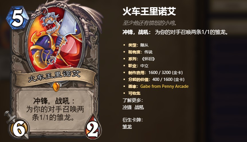 先来聊的第一个就是火车王。对于很多玩家来说,火车王一定是非常熟悉的。不管是快攻还是中速卡组,在当年那个时代,一般都会带个火车王,然后在对面的血量达到斩杀线的时候,一个火车王拍到场上,然后一个冲锋直接终结掉。可以这样说,每一个火车王的入场都能带来一场胜利。