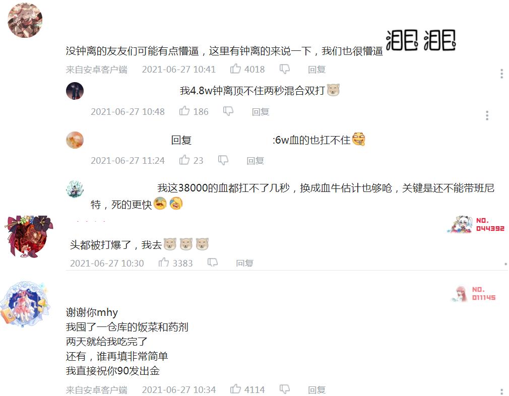 虽然在原神官方的介绍下这两位boss的机制显得通俗易懂,但实际战斗后却让玩家叫苦不迭。在原神官号的评论区中,许多玩家都吐槽双魔偶剑鬼的组合真的太难,并纷纷猜测这次活动有没有强抬钟离的可能性。不过这种想法似乎不合情理,部分拥有钟离玩家表示有帝君用途也不大,六万血的钟离也扛不住剑鬼的混合双打。