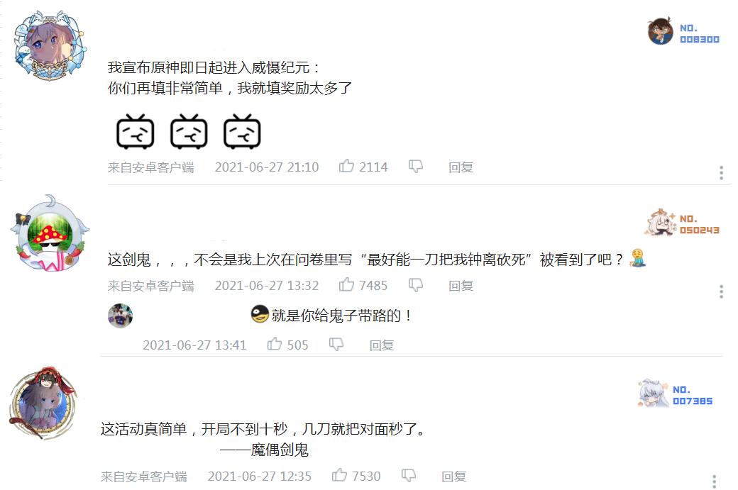 也有许多原神玩家认为,游戏官方突然上调boss难度应该和原神的数次的调查问卷有关,毕竟头铁和爱开玩笑的旅行者每次都填的“非常简单”。更有甚者在问卷中还曾夸下海口,请求官方“最好能一击把钟离秒掉”。或许正是在这种错误的反馈之下,原神策划才整出如此虐人的两位剑鬼。