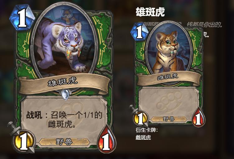 先不说理财鱼人,就说说这个理财老虎吧。平常大家在之前的天梯中估计也能见到,作为一个一费两个1-1的随从。对于野兽猎来说,这俩小老虎还是挺好用的,前期拿出来送送人头,为之后的大哥抢节奏啥的真香,只不过估计大家见到最多的小老虎也只是个1-1了吧。就在最近,刘年竟意外发现了一个最有牌面的小老虎,那身材连大表哥都表示给跪了。