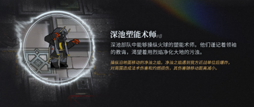 深池焚毁者是喷火兵,发动技能会造成法术伤害和灼燃损伤,击倒后会爆炸,并会击倒周围的破碎石柱和小兵。深池伙友卫队是用来吸引火力的,当伙友影刃位于附近的时候,会发动技能减速周围的我方干员攻击速度。而影刃具有很强的隐匿能力,特点是与伙友卫队一起行动的时候攻击速度大幅提升。在新关卡中,最需要注意的应该是深池塑能术师,技能是操纵火焰,遇到我方单位后会爆炸,并对周围造成法术伤害和灼燃伤害,产生范围伤害。