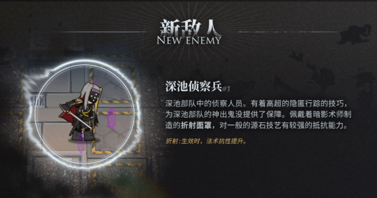 首先见到的是深池侦察兵,根据介绍他们有着高超的隐匿行踪的技巧,在法术抗性上有大幅提升,对一般的源石技艺有较强的抵抗能力,直白的说,术士打他们不好打了。