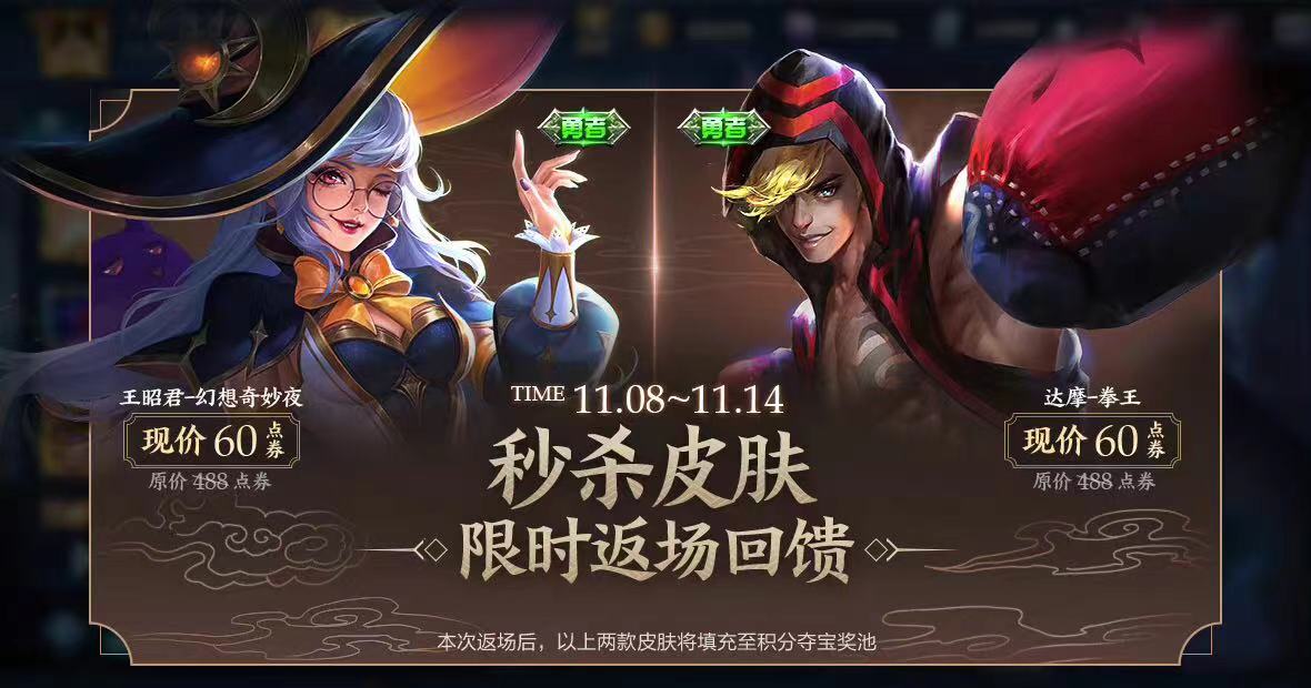 在前两年的双十一期间,王者荣耀也推出了不同的活动,基本都是返场限定皮肤和推出勇者皮肤,第一次返场的是王昭君的幻想奇妙夜和达摩的拳皇,登录就送11钻石,这个11钻石简直又无奈又好笑。