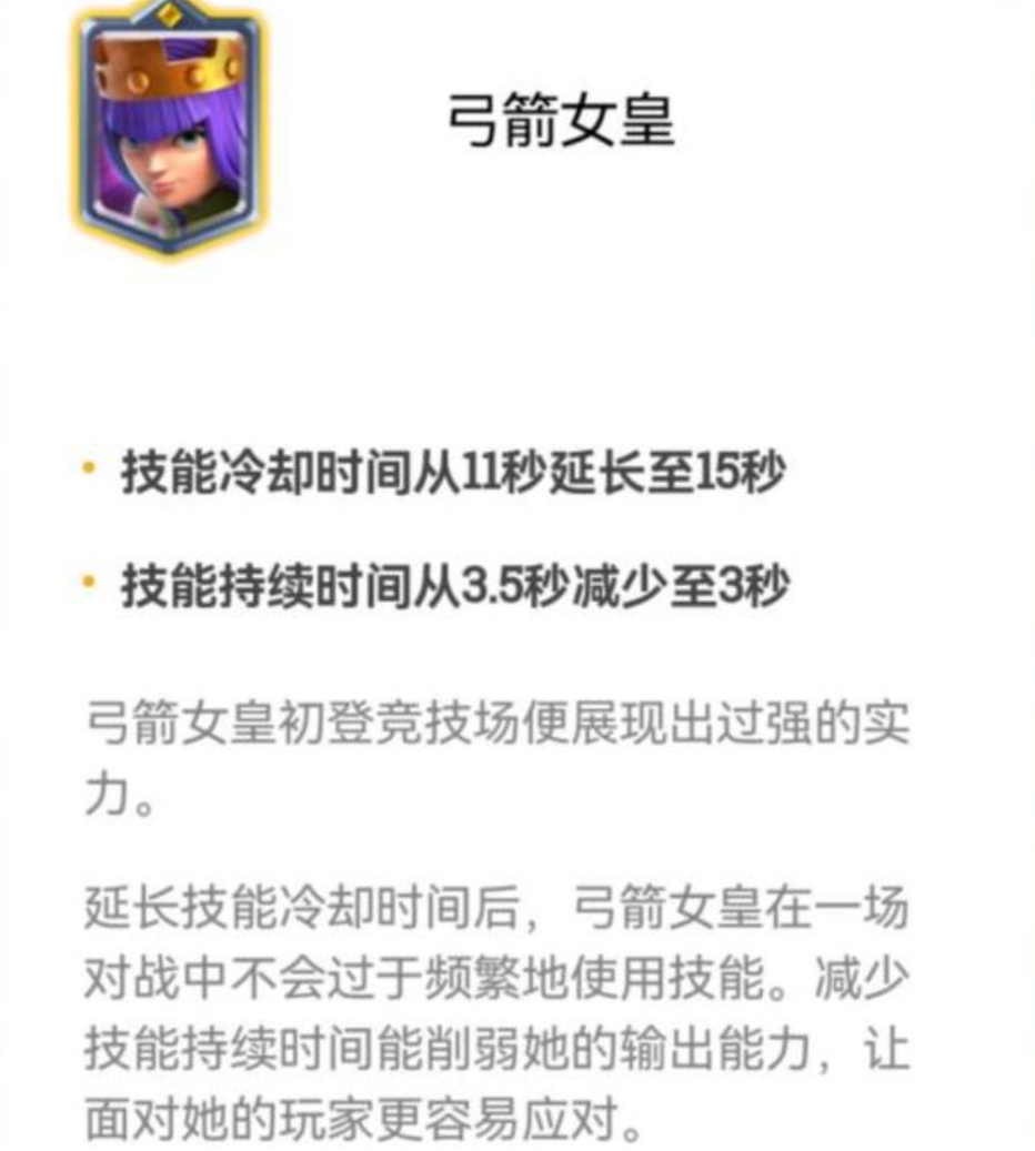 即便是刚经历了一波削弱,弓箭女皇依然是可以用的,官方没让她太惨,在防守的时候变现依然十分强势,只是相对以前那种超标而言,变得正常了而已,这一个波削弱可是说让很多玩家都表示很满意,而骷髅王却是要加强了,看介绍它的机制那么强,但是上线之后却有点惨。