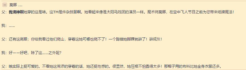 老人吐起槽来也完全不输给年轻人,这大概是莫娜被黑得最惨的一次了,居然被认为像是马戏团演员,不过想想魔法和魔术差距好像也不大,让她加入马戏团应该还是挺有趣的一件事。当然还是改变不了老人的视角,以现实的角度去看待了莫娜的装束,认为她穿着这一身可不适合去冒险,会有危险的。
