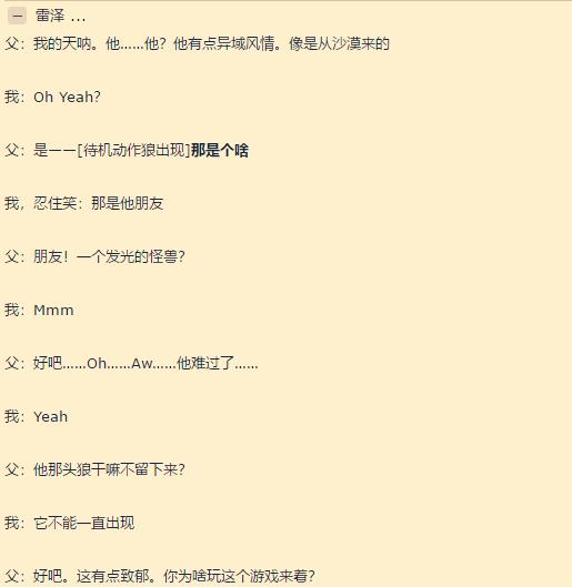 老人对于雷泽的第一印象还是很不错的,认为他有一种异域风情的感觉,可能与他的装束上有兜帽有关系。当狼出现时还把老人吓了一跳,难以相信一个可爱的孩子会与发光的怪事成为朋友,不过很快就接受了这样的关系,甚至还希望狼能够一直留在雷泽身边,也只能是一个美好的期望而已了。
