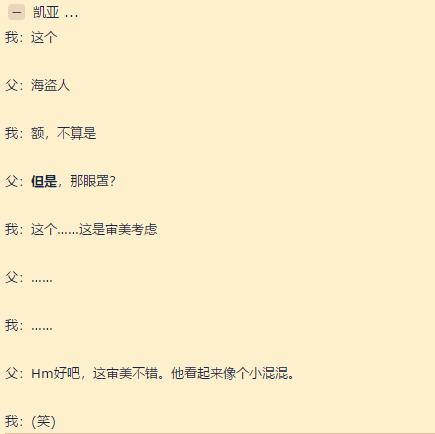 在老人眼里,戴着单眼眼罩的都属于海盗家族,凯亚自然也不例外。只不过凯亚的形象看起来比较冷酷,有点缺乏亲和力,看起来不是那种温柔可爱的男生形象,所以被老人认为有点像是个小混混。对凯亚这样的误解也曾经出现在很多萌新身上,时间久了才慢慢对他有所改观。