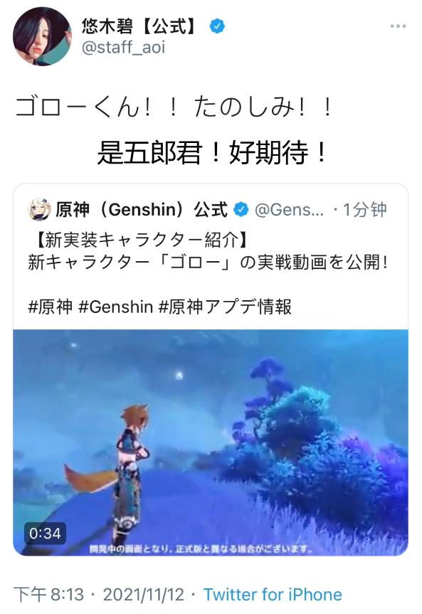 在日本声优悠木碧最新的蓝鸟动态中,她转发了日服原神官方对五郎的介绍视频,并发文表示十分期待五郎君的登场。这则看似稀疏平常的消息引起许多粉丝和玩家的注意,因为他们发现悠木碧似乎是踩点蹲守了原神官方的这段角色介绍,并且在官方发布的1分钟之内就转载了这个视频。