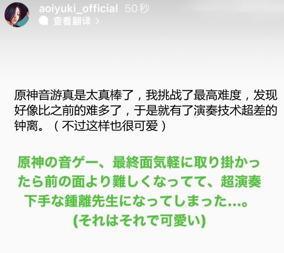 不过这些林林总总的冒险经历也从侧面说明,拥有原神玩家身份的声优悠木碧并不掺假。从悠木碧的所有游戏动态上看,她在玩原神时对游戏的所有内容几乎面面俱到,这是否意味着悠木碧作为原神玩家的纯度远高其他普通玩家。