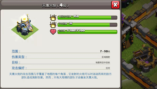 在目前的版本里,“天鹰火炮”分为5个等级,前两级的触发单位是180,而3到4级的触发单位是200。