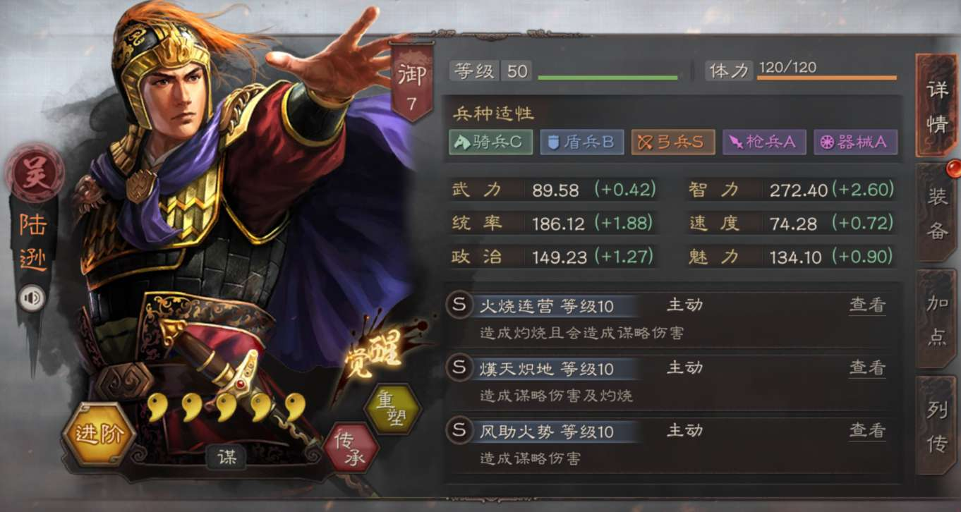 陆逊先后跟随孙权多年,统率吴国军政十几年,深得孙权器重。忠诚刚直,深谋远虑。被封为社稷之臣。在游戏中呢陆逊的武将基础属性方面,智力和统率值是比较高的,速度慢是大多谋略型武将的一个通病了,但是作为一名谋略输出的武将,武力值的高低根本没有无关痛痒。兵种的适应方面,我们只有S级别的弓兵,所以如果是陆逊c的话只能是弓箭队伍了。