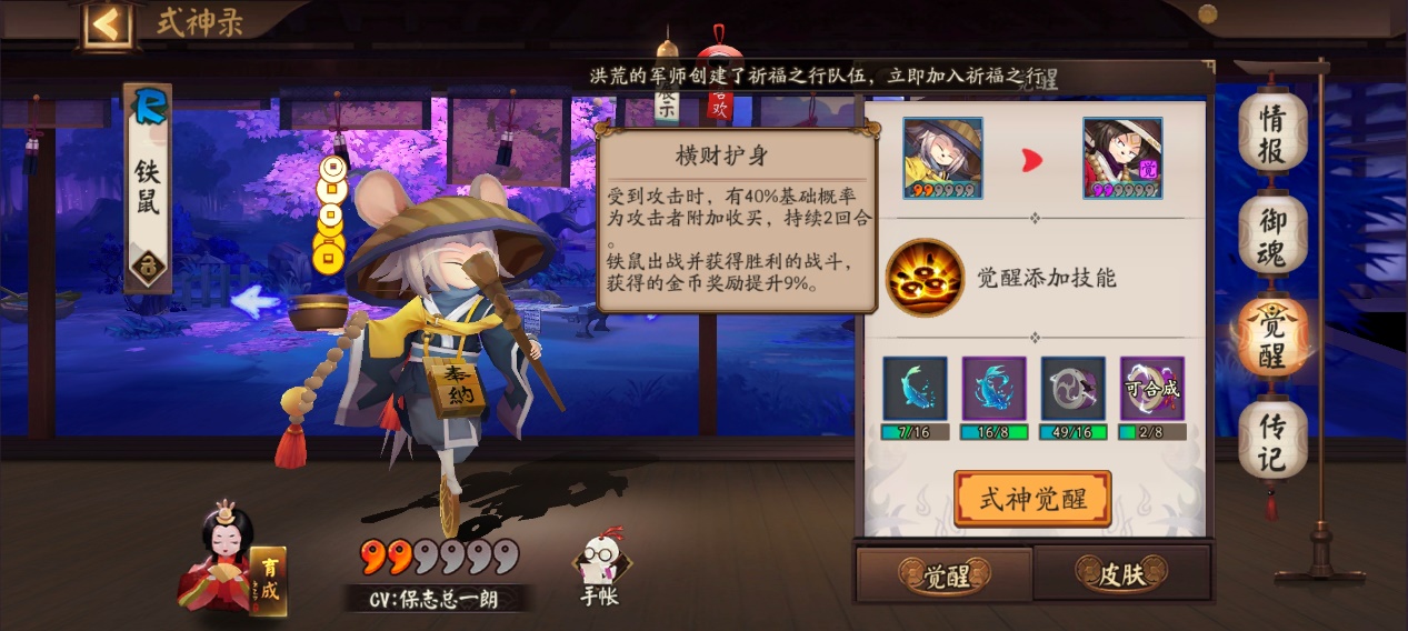 因为铁鼠二技能自带有金币加成,且觉醒后奖励提升到9%。所以一定要先觉醒!觉醒后才有效果。接着在战斗的时候,带铁鼠上场,金币数量会大幅提升。日常可以出战石距,年兽。突破出战可搭配二星1级兔子和火机,火机不需要满五级技能,火也够的。