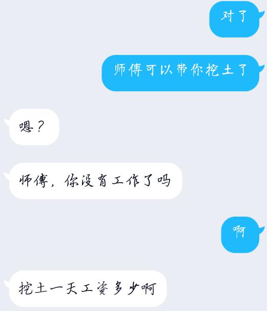 这个梗来自师傅与徒弟的对话,可爱的萌新徒弟还不知道挖土指的是打游戏里的魂土,也就是学名为巫女大蛇悲鸣的副本,天真地以为师傅没有工作了,还准备打听一下挖土一天工资多少,让人看了哭笑不得。