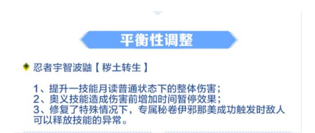 而最后一个改动是伊邪那美密卷优化,这个是因为有玩家触发以后,对面还是放出技能,所以优化避免这种情况发生。综合来看,这次改动一技能和奥义都会有一些变化,尽管加强幅度没有那么大,不过他打伤害的速度应该是提升了,奥义时停也可以用来放心的终结对方,现在就等一下他生效后的实战效果啦。