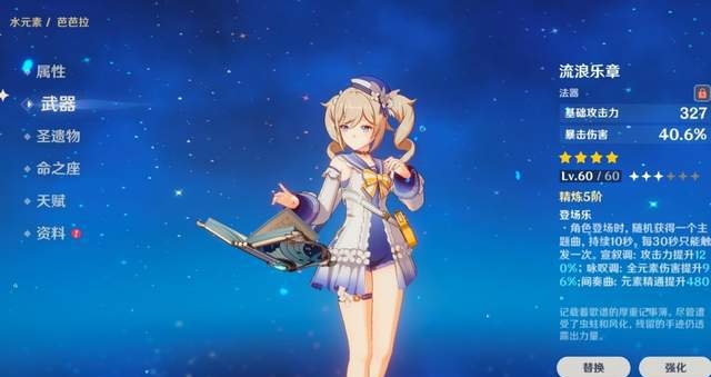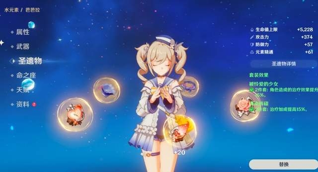 在圣遗物选择方面,如果芭芭拉是作为纯辅助上场的,推荐的是二少女和二海染,这样就可以大幅度提升回复能力,整体伤害也会跟着提高。悠然建议芭芭拉选择武器的时候可以用五星不灭月华,特点是治疗和输出同时进行。同心海相比,五星不灭月华武器提供的伤害比率更高。除此之外试作金柏,也是一个不错的选择,在芭芭拉元素爆发的时候,试作金柏可以增加血量,并且提供后续的回复能力。