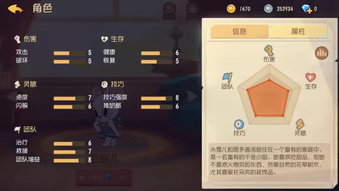 从米雪儿的属性面板上来看,它的各方面的属性都比较均衡,移动速度算是比较突出的了,如果在游戏当中合理的配上武器技能就可以实现加速救援队友的效果。