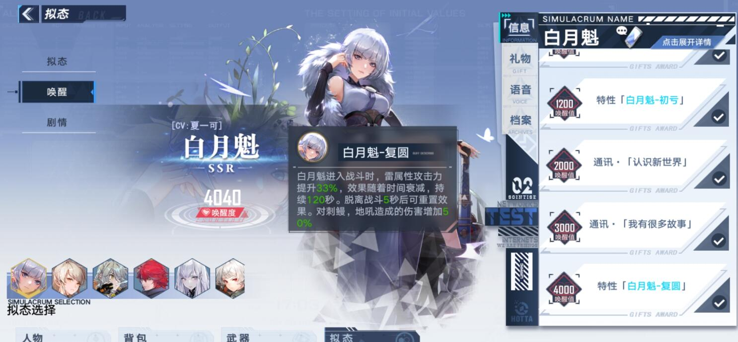 以此前联动版本的拟态角色白月魁为例,当玩家给她赠送礼物,使其唤醒值达到4000之后,便可以激活一个雷属性攻击力提升33%,但会随着时间持续性衰减的被动效果。而除被动技能效果之外,随着唤醒值的提高,这些拟态角色还会像朋友一样,时不时的给玩家发邮件,每逢节日送点小礼物,十分暖心。