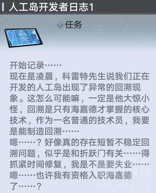 当然,除了这些外在设计之外,人工岛上还有许多内在细节值得细细品味。以登岛后便会接到的首个“收集10本人工岛开发日志”这个任务为例,任务本身基本没有难度,比如第一本就在“零号基地”面前的蓝色“折跃点”终点附近,但收获的道具却是彩蛋满满,策划将《幻塔》开服至今的一些开发经历全都写了出来,值得回味一番。