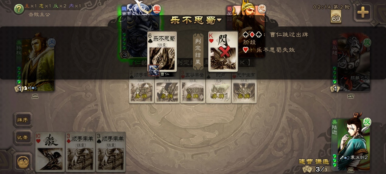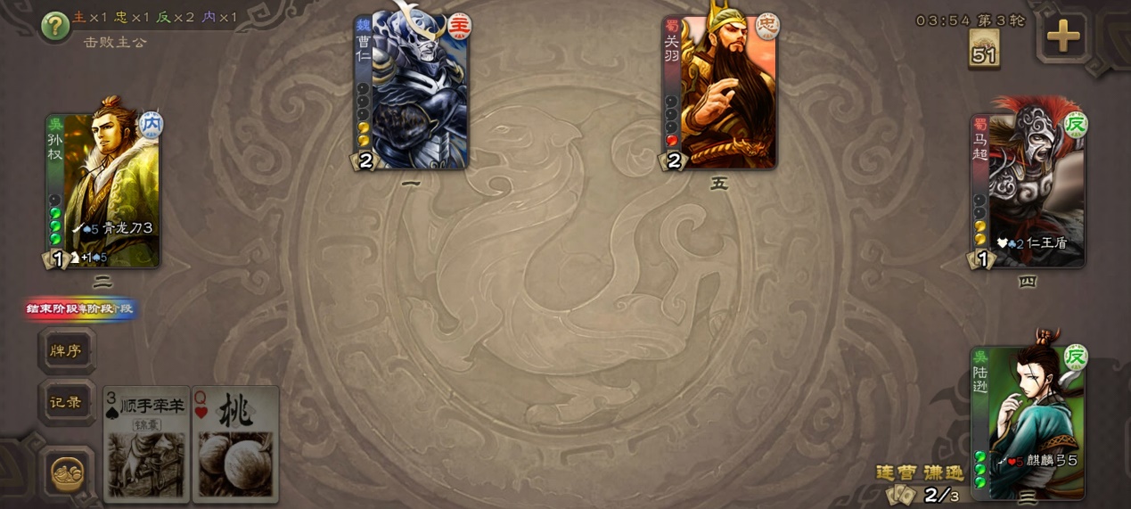 又和大家见面啦,接下来我们来分享军八场基本功。开局的话,我们要先快速判断忠诚,反贼,内奸。这边的话会有一个位置判断,忠诚的话离主公会近一点,反贼跟内奸,偏反向哦。接下来就是排序跟意识的问题了,先过牌在用牌受益最大,无用锦囊可以试着先无懈图条,先拆队伍按顺序一个个击杀,然后打出伤害,打出压制。