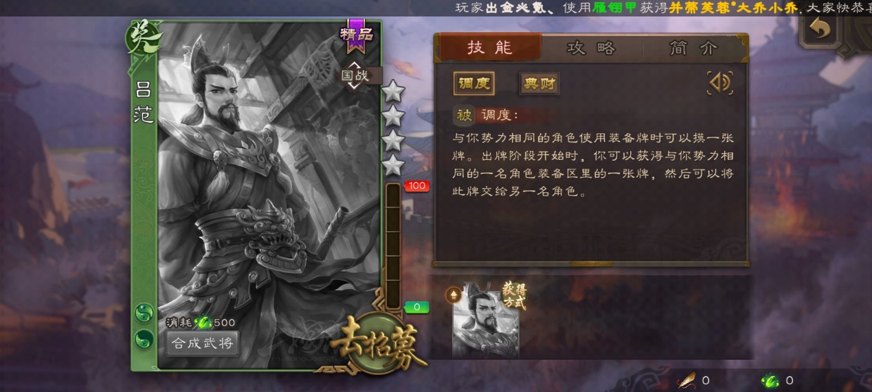 吕范的一技能,用处挺大的,是个强过牌跟强辅助的能力,除了可以带给队友大量的装备之外,还可以直接让队友装备重新调整分配。我们来举一个例子,比如说你可以把防护具给与之相对应的脆皮鲁肃,或者二张,也可以把武器分给腿短的队友,来提高队友的综合实力。