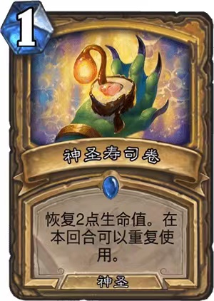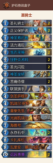 我们先介绍控制奶骑,这套卡组有圣光闪现/活力闪现还有神圣寿司卷提供血量支持,还有炎术师+生而平等这样强势的清场套路,让骑士中期控场之后可以把血量安稳的抬上来。