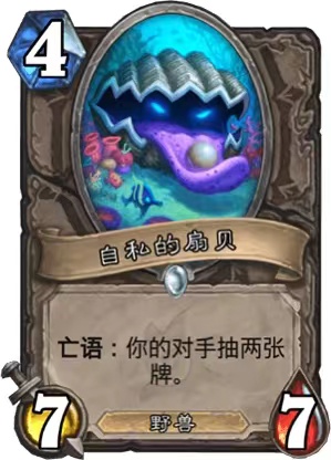 第二套我们在介绍贝壳疲劳术,这套卡组游戏节奏较慢,基本上在半个小时左右。这套扇贝爆牌术士玩法和猫头鹰OTK术士思路相同,但是扇贝爆牌术士是利用【自私的扇贝】爆牌让对手疲劳而死。