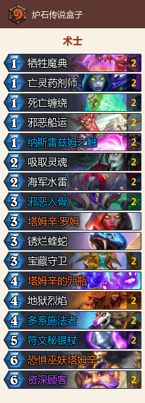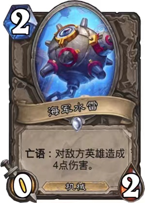 这套水雷术卡组,总体上来说是术士卡组里面最能适应天梯环境的。以原来的猫头鹰术为底子,把高费的【巨型猫头鹰】扔掉了,换上了【海军水雷】,虽然OTK伤害降低了一半,但是也已经足够用了,而且【海军水雷】是精准炸脸的,不会出现炸歪的情况。