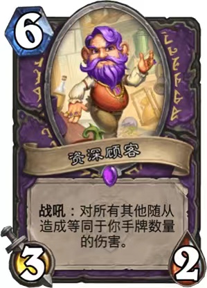 但就目前版本来看,天梯充斥着大量德鲁伊,术士玩家开始想办法处理德鲁伊超展开的纳迦巨人。8费的两个清场【扭曲虚空】和【老巨鳍】显然费用太高了,这套卡组的核心卡片就把目光投向了坐冷板凳许久的【资深顾客】身上。