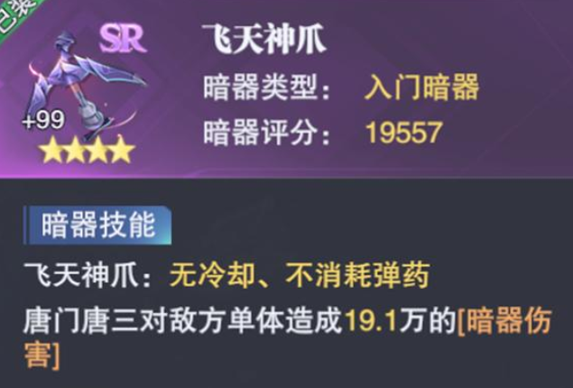 首先就是入门暗器,也就是普通攻击暗器当中的飞天神爪和无声袖剑,虽然在游戏当中不是那么起眼。这两个暗器的品阶其实没有达到SSR的级别,但是这两个暗器在部分场合是有着非常强的作用的。