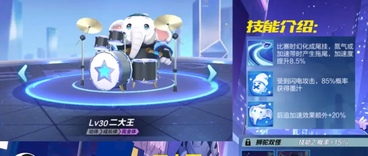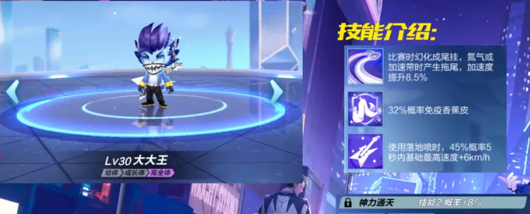 除此之外就是二大王,二大王这只宠物在游戏当中对于腾空的地图来说,作用是非常大的,它拥有着32%的概率能够免疫香蕉皮在道具模式当中的伤害,虽然并不高,但是他还拥有着三技能,在使用落地喷的时候获得非常不错的速度加成效果,当然这只宠物最主要的效果和发挥还是在腾空地图当中。小伙伴们都学到了吗?