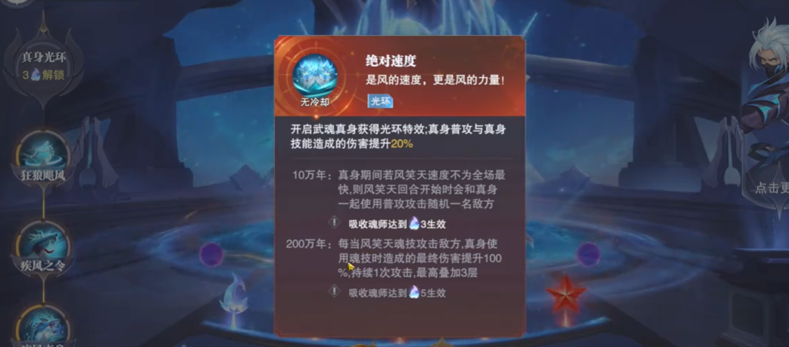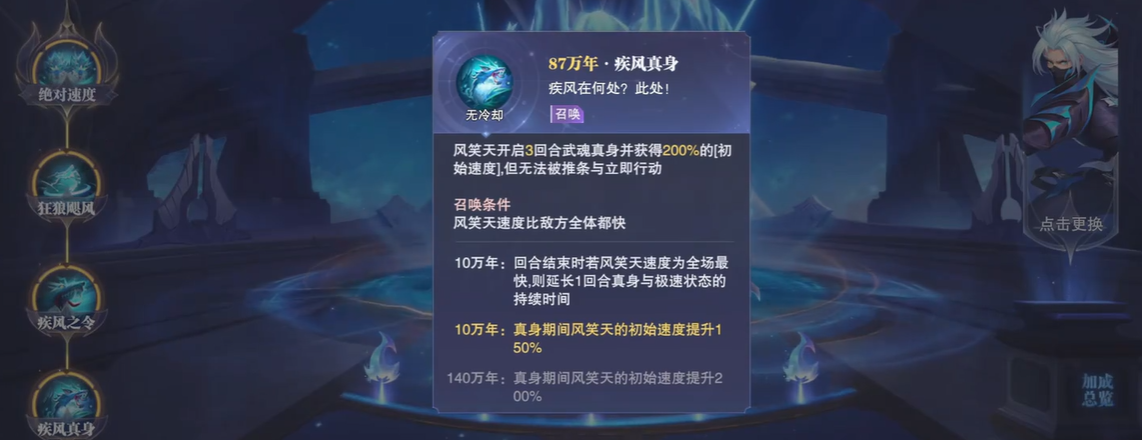 在我们召唤武魂真身之后,风笑天就可以获得100%的初始速度,虽然它会丧失被行动条推进和立即行动的效果。并且风笑天的速度为全场最快的时候,它的真身和极速状态可以延长一个回合。从这一点可以了解到,风笑天在游戏当中的武魂真身是可以持续全场的。并且它的激素状态的延续,也可以让风笑天不用在后续的回合当中额外使用,技能提升了它在长时间副本当中的伤害输出。