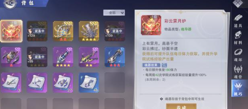 首先我们可以看到,当我们升级到紫色一星之后,会每日额外获得六十点体力,而当我们升级到金色一星之后,每日会额外获得120点体力以及学院试炼的经验值提升,当魂导器升级到红色一星之后,每天会额外获得180点体力,并且前42次的学员试炼经验值也会提升100%。