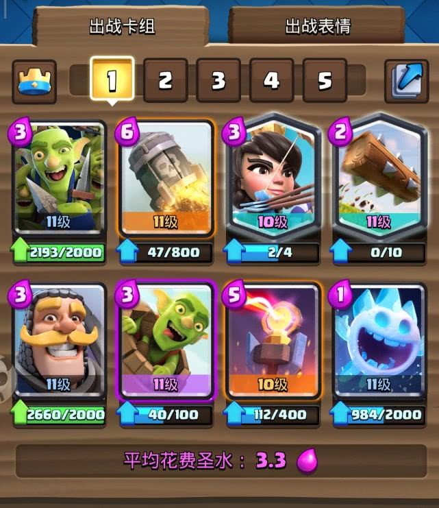 最初的卡组是由公主,哥布林团伙,哥布林飞桶,滚木,冰雪精灵为速转卡牌,地狱塔和大火箭作为防守卡牌提供后续支持,这套卡组可以利用速转卡牌不断防守让对方无懈可击,等到速转卡牌出到哥布林飞桶之后就可以进行远程消耗磨血了,一旦对面的玩家出现回防失败的情况,那么哥布林飞桶就可以凭借着自身的高血量和高伤害,轻松灭掉对面的一个皇室塔。
