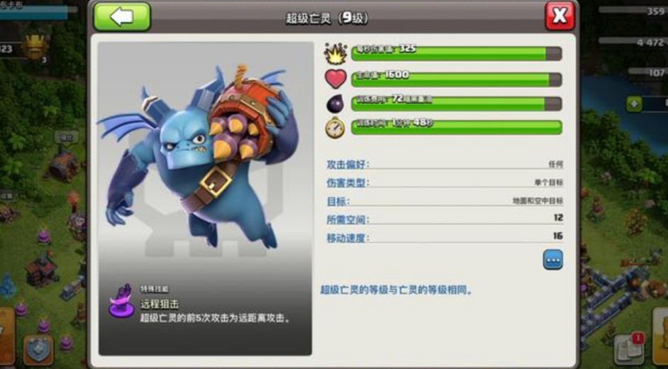 在超级兵种中,如果提到防守,玩家一定会想到超级亡灵。它在出场的时候就可以打出高额的爆发伤害,输出能力又很强,攻击距离也比较远,远程狙击都没有问题。在阵型当中,很多兵种都不能快速打掉它,用毒药和冰冻法术都不能很好的克制,很多玩家面对它也是非常的头疼。