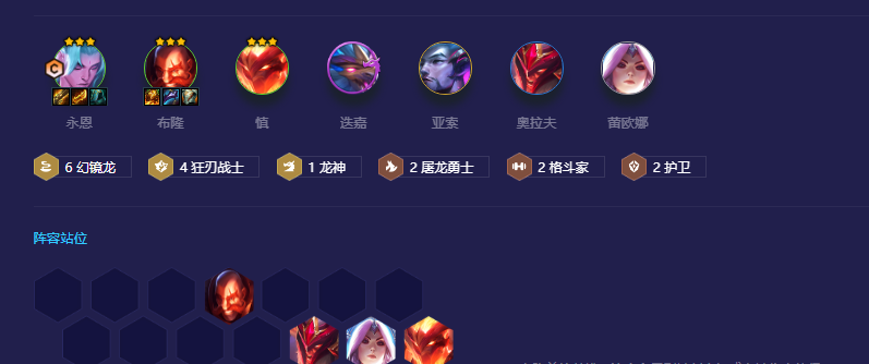 阵容搭配有:永恩、布隆、慎、迭嘉、亚索、奥拉夫、蕾欧娜。这套阵容站位比较看重,在前期把布隆丢前面,形成7字形,主C是永恩所以围着他打就行。而亚索单独丢一边放出属性就好,前期不升级不刷牌,一到3-2升6人口开始梭哈,后面直接慢刷三星永恩和布隆,毕竟这两张算是王牌。如果没有牌那就用剑魔先挡着,所以这套阵容也怕同行。
